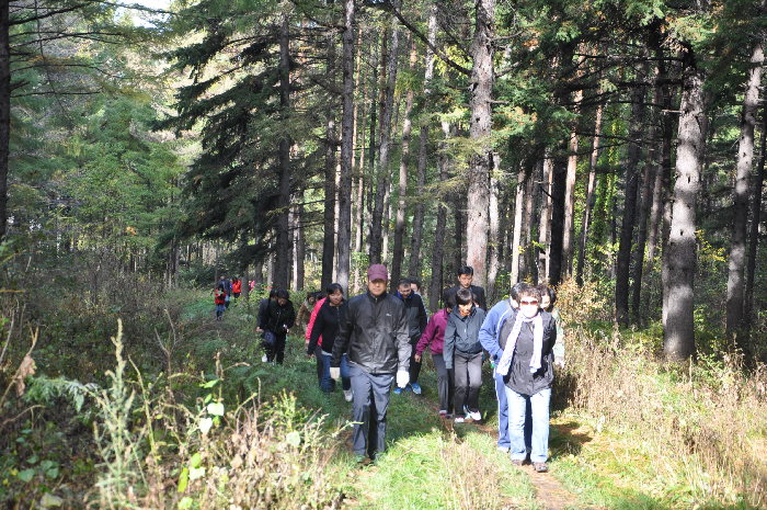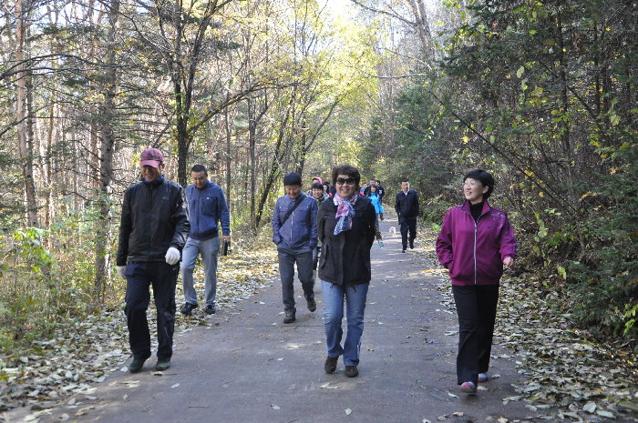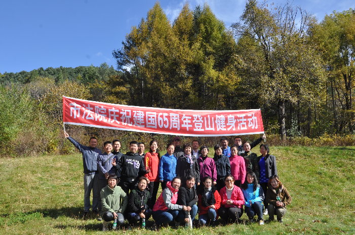 当层林尽染,五彩缤纷山色斑驳之时,迎来了伟大祖国六十五周年华诞。为高涨爱国热情、激发为民情怀和倡导强身健体,在国庆前夕,在伊春中院院长石岩梅的倡议下,机关干警举行了迎庆“十一”国庆登山活动。