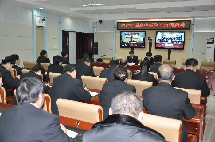 12月5日,伊春中院召开全市法院视频会议,传达学习最高法院院长周强在全国高中级法院院长学习贯彻党的十八届四中全会精神培训班开班仪式上的重要讲话。中院院长石岩梅传达和解读了周强讲话精神。中院常务副院长单玉波主持会议。中院班子成员、机关各部门正副职和部分干警在主会场参加会议,各基层法院全体干警在分会场参加会议。