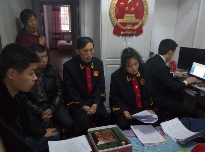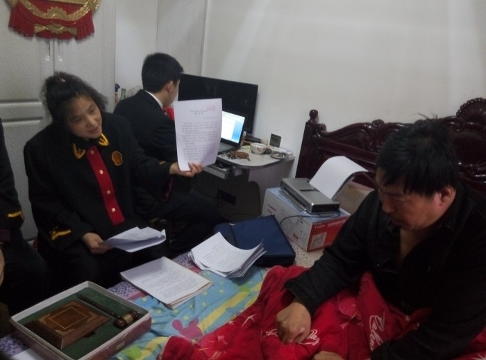 在被告人姚某的家中,衣柜上挂上国徽,两名审判员、一名人民陪审员和两名公诉人围坐在被告人床边,一个临时法庭就这样搭成了。12月12日14时,因为当事人行动不便,美溪区法院将当事家布置成临时法庭,审理了一起危险驾驶罪案件。