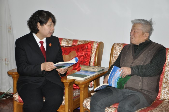 石岩梅一进门就与老院长亲切地攀谈起了家常,看到老院长白发红颜,她感到非常高兴。虽到耄耋之年,但老院长依然笔耕不辍,拿出新出版的收录了他10多篇文章的《伊春文史资料》,与石岩梅交流畅谈写作体会。之后,石岩梅向老院长介绍了法院一年来的工作,老院长对法院取得的成绩感到欣慰。