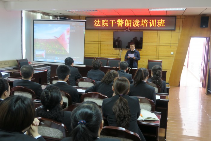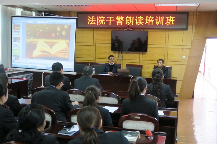 活动中,新青区法院党组书记、院长荣涛特邀本区司法局局长武尚盛来到法院为干警讲授了一节朗读技巧讲座,武局长具有丰富的朗读经验及深厚的写作功底,他在讲座中采用示范朗读、现场练习及一对一点评等方式为干警们呈现了一场朗读盛宴,干警们在欣赏专业朗读的同时不断学习揣摩朗读技巧,力求表现出句子中的每一份情怀。讲座现场,荣涛院长、于虹副院长率先垂范,分别朗读了《沁园春•雪》《百合花开》。
