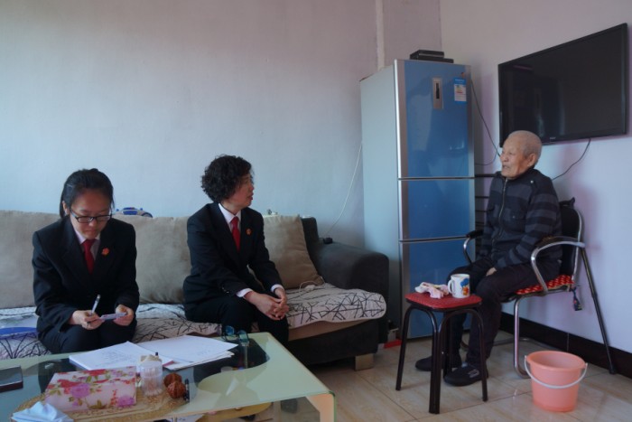 在询问过程中,万法官了解到当事人贾某今年85岁高龄,患有脑梗塞、白内障,生活不能自理,需要人常年照顾,目前住在小儿子里。鉴于当事人行动极为不便,秉承着便民服务的宗旨,万法官立即决定,为当事人进行上门立案服务。