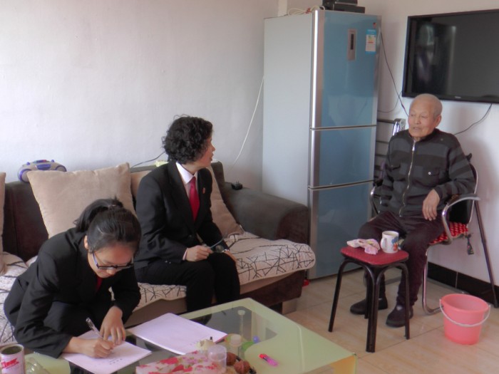 万法官坐定后,同贾某交谈,详细地询问其他子女的情况和需要解决的问题,贾某时而清醒,时而糊涂,口中还不断重复“我寒心了”。最终在他小儿子和儿媳的帮助下,老人断断续续地讲述了事情的经过,书记员详细地记录了老人的诉求。随后,万法官向夫妻俩告知如何起诉及所需提交的材料,并让他们尽快向法院提起诉状,以便尽早立案。