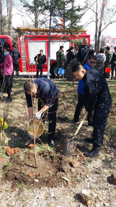 在植树活动现场,干警们热情高涨,或三人一组、或二人配合,挖坑、插苗、填土、浇水,大家忙得不亦乐乎,发扬不怕苦、不怕累、不怕脏的顽强拼搏精神,大家分工协调,配合默契,经过2个多小时的奋战,圆满地完成植树任务。