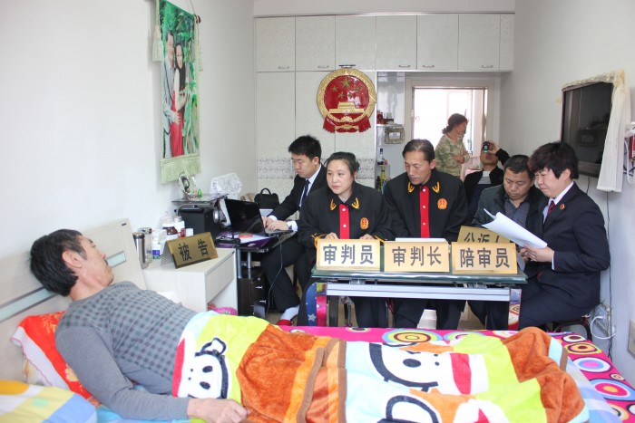 近日,美溪区法院刑事审判庭两名党员法官同一名人民陪审员、一名公诉人一起来到美溪区文博园小区被告人王某家中审理了一起交通肇事罪案件并当庭宣判。