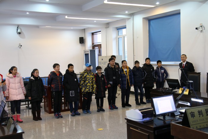 在法院工作人员的引领下,同学们先后参观了法院的诉讼服务中心、远程视频接待室、审判庭、文化长廊、荣誉室、执行指挥中心等场所。相关工作人员为孩子们做了细致的讲解,包含法徽、法袍、法槌、天平的含义,并“以案说法”给学生们讲授了一堂生动的法律课,教育引导学生们要做一名遵纪守法的好学生,学会拿起法律的武器保护好自己。学生们还穿起法袍,模拟开庭,当了一次小小审判员。