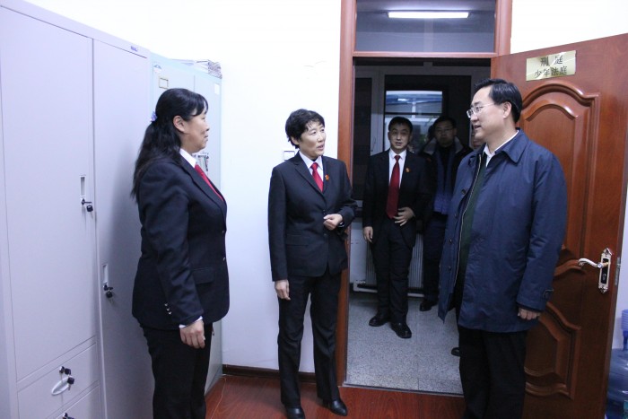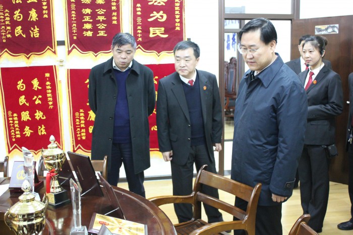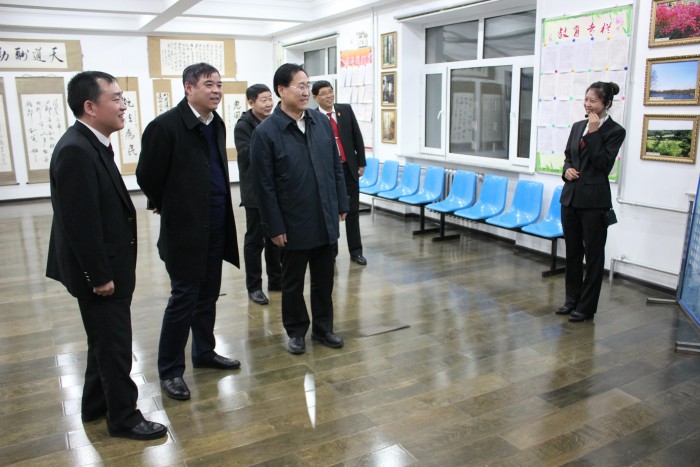 在带岭区法院,韩日强在带岭区委书记祝天姝,区委副书记、政法委书记李茂义的陪同下实地查看了带岭区法院的办案办公环境建设情况,听取了带岭区法院院长王连勇的工作汇报,对带岭法院队伍建设和文化建设给予肯定。