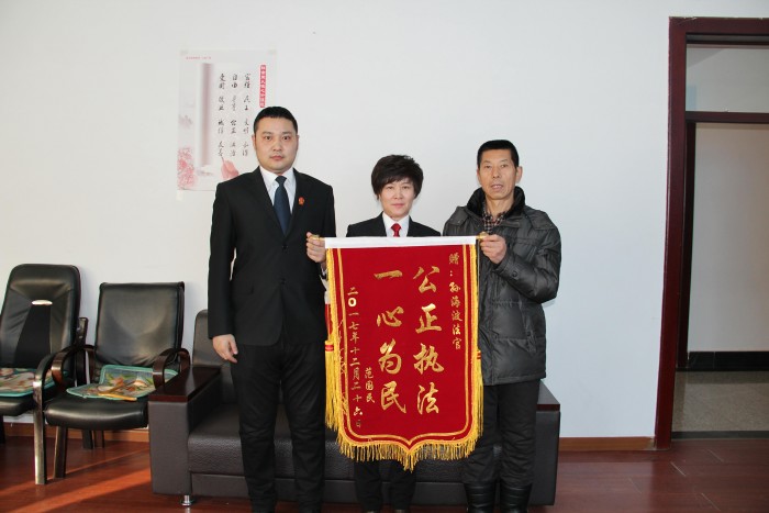 范国民激动地说:“感谢乌马河区法院,要不是你们法官公正执法,我这损失就要不回来了,你们为我伸张了正义,主持了公道,我无以为报,我请人制作了一面锦旗,以表达我的心意和对孙法官崇高的敬意!”