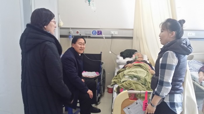 春节前气候的异常,导致老院长杨国奎肺部受到感染,在医院接受治疗。当韩日强看到87岁高龄的老院长后,非常高兴,亲切地和他唠起了家常,并不时地向他的女儿了解老院长的病情和生活现状。韩日强对老院长说,“看到你气色不错,思维敏捷,我们都感到由衷地高兴,没有你们老前辈奠定的良好基础,哪有越来越好的法院今天,你们就是我们最宝贵的财富,好好养病,等到天气暖乎了,我们以公众开放日的形式把老院长和法院老同志邀请到院里,看一下咱们法院发生的巨大变化,为我们建言献策,推动我们法院工作实现新发展。”