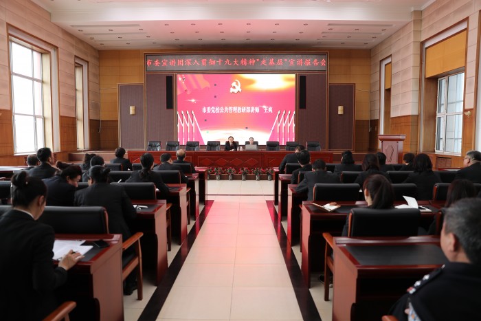 4月20日,伊春市委学习宣传贯彻党的十九大精神“走基层”宣讲团走进伊春市中级人民法院举行宣讲报告会。宣讲团成员、伊春市委党校公共管理教研部讲师王爽以《奋进新时代 谱写现代化伊春新篇章》为题作宣讲报告。伊春中院机关80余名干警认真聆听了宣讲报告会。