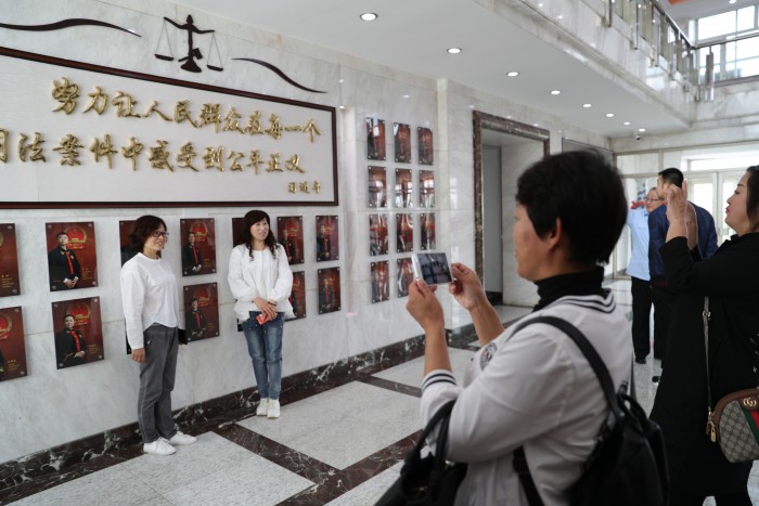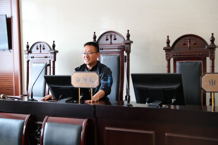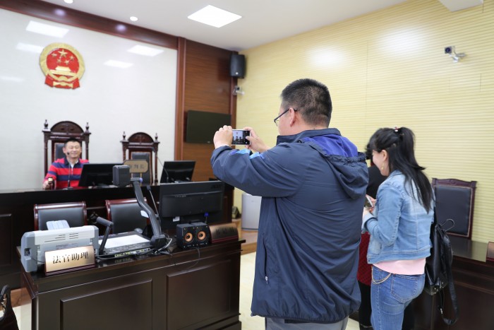 来到科技法庭,参观人员赞叹审判法庭庄严肃穆、信息化程度高,他们坐在审判席前拍照留念,久久不舍离去。