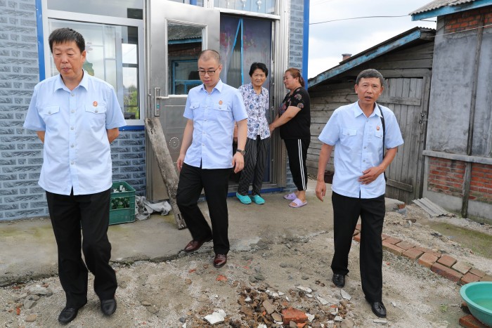连日来,伊春市境内暴雨不断,多地发生汛情,局部地区受灾,7月31日,伊春市中级人民法院党组书记、院长、市中院扶贫包联工作领导小组组长韩日强委派市中院9个扶贫包联工作小组迅速深入到铁力市桃山镇石长村扶贫包联对象家中,了解受灾情况,为市中院党组谋划扶贫攻坚和灾后重建工作提供依据。