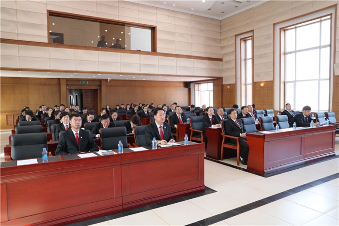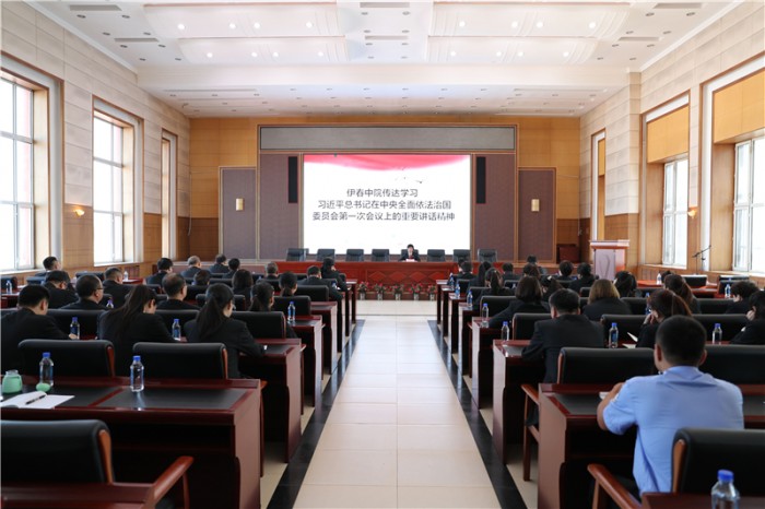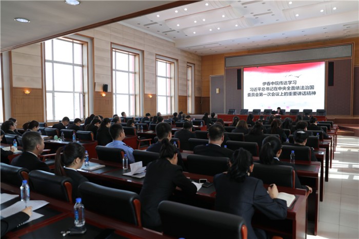 9月14日上午,按照黑龙江省“法治建设年”活动专项领导小组具体工作安排。伊春中院贯彻全面依法治国委员会第一次会议精神专题学习会在七楼会议室召开。中院党组成员、政治部主任赵冶萍在会上传达了习近平总书记在中央全面依法治国委员会第一次会议上的重要讲话精神。中院党组书记、院长韩日强、党组成员及全体干警出席会议。