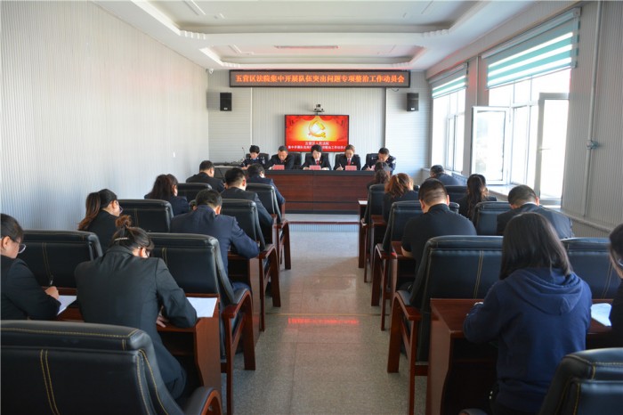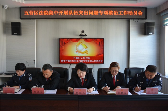 会上,党组书记、院长曹雪飞传达了伊春市中级人民法院集中开展队伍突出问题专项整治工作动员会的会议精神和市中院党组书记、院长韩日强的讲话精神,并就集中开展队伍突出问题专项整治工作作了动员讲话。党组成员、政工科科长王欣宣读了《五营区人民法院集中开展队伍突出问题专项整治工作方案》。