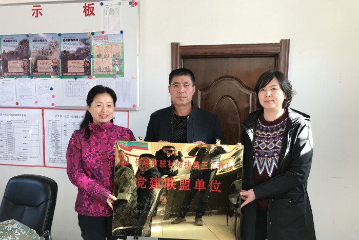 伊春中院机关党委书记徐景伟、市人社局机关党总支副书记陈硕与石长村党支部书记曹正亮共同为党建联盟揭牌。