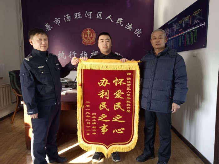 2月18日上午,赵华林来到伊春市汤旺河区人民法院执行局满怀激动地送上一面锦旗,以感谢在春节前夕执行局为他追回了多年欠款,执行干警的辛苦付出,让他过上一个安稳年。