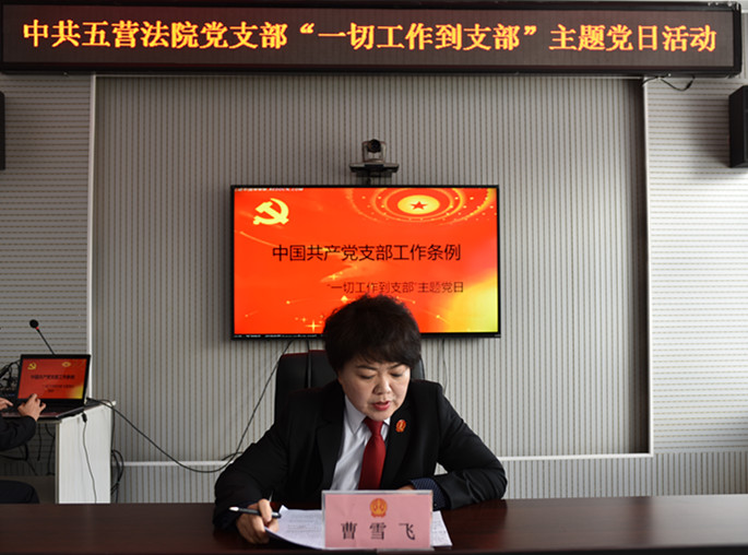 为贯彻落实伊春中院院长韩日强在2018年度全市法院党建和意识形态工作汇报会上的讲话精神,2月22日下午,伊春市五营区人民法院组织开展“一切工作到支部”主题党日活动,党组书记、院长曹雪飞为全体党员、积极分子上了一堂生动地《中国共产党支部工作条例(试行)》专题党课。