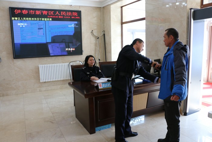 伊春市新青区人民法院法警队认真落实省院石时态院长提出的“努力让老百姓在全省法院打官司不求人”的承诺,守住安检第一关,用老百姓看得见的四项措施为老百姓提供安全的诉讼环境,让老百姓感受到法院的温暖服务:一、查验并登记被检者的有效证件;二、将被检者的随身携带物品放入X光机进行检查;三、引导被检者通过安检门;四、对被检者进行人身安全检查。安检结束后,提醒被检人员取走随身携带的物品,并对限制物品予以寄存。