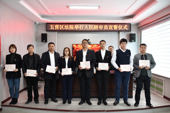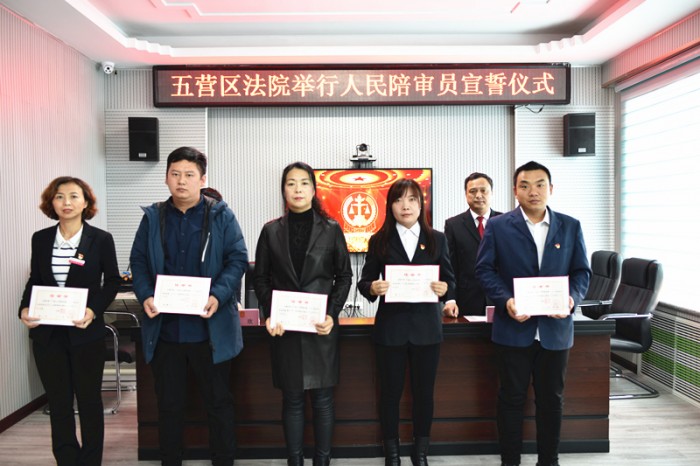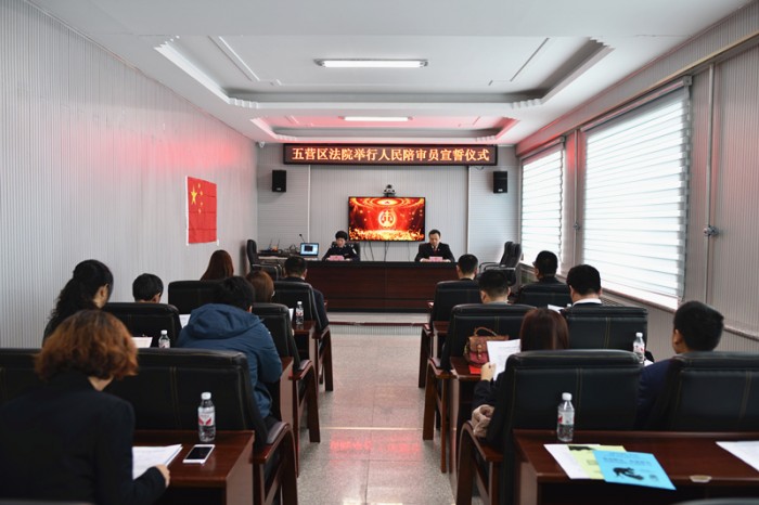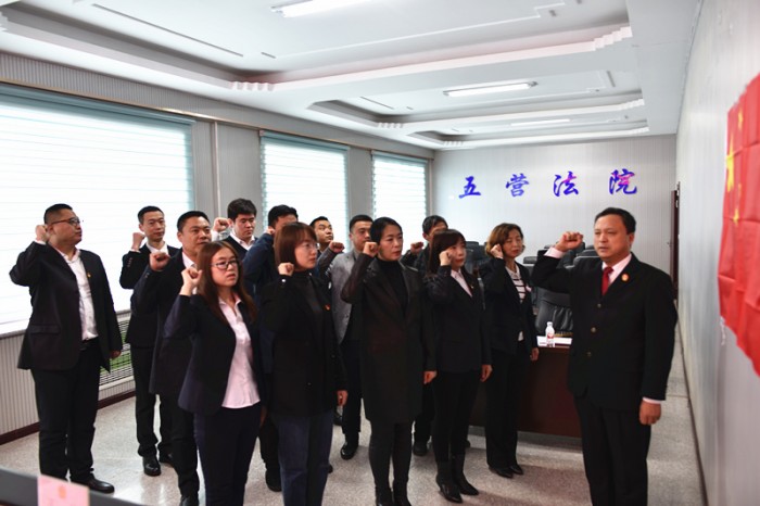 开放日活动前,五营区法院举行了人民陪审员宣誓仪式。副院长刘召东宣读了《五营区人大常委会关于任命人民陪审员的决定》,为新任命的16名人民陪审员颁发了任命书。嘹亮的国歌奏响后,新任人民陪审员面对国旗,在领誓人刘召东的带领下,铿锵有力齐声宣读宣誓誓词,“我是中华人民共和国人民陪审员,我宣誓:忠于国家,忠于人民,忠于宪法和法律,依法参加审判活动,忠实履行陪审职责,廉洁诚信,秉公判断,维护社会公平正义!”。2018年4月27日《中华人民共和国人民陪审员法》颁布实施后,五营法院首批人民陪审员正式就职上岗,依法参加区法院的审判活动。