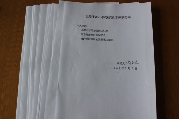 刀刃向内深挖彻查,自我清理黑恶保护伞。加强自身队伍建设,是铲除黑恶势力滋生土壤的治本之策、关键之举。建立内部检查机制,核实本单位是否存在涉黑涉恶“保护伞”情况,一个个“过筛子”,坚决把涉黑涉恶从自身祛除,通过设立扫黑除恶领导小组,明确职责,通过明察暗访、座谈等形式组织谈话10余次、10余人,签订《党员干部不参与涉黑涉恶承诺书》22份。只有基层组织坚强有力,根基才能牢固,才能有战斗力。只有打掉黑恶势力“保护伞”,才能不断增强人民群众的获得感、幸福感和安全感。