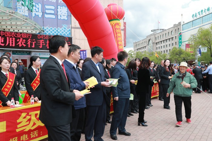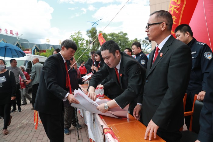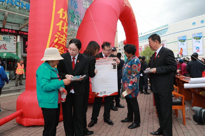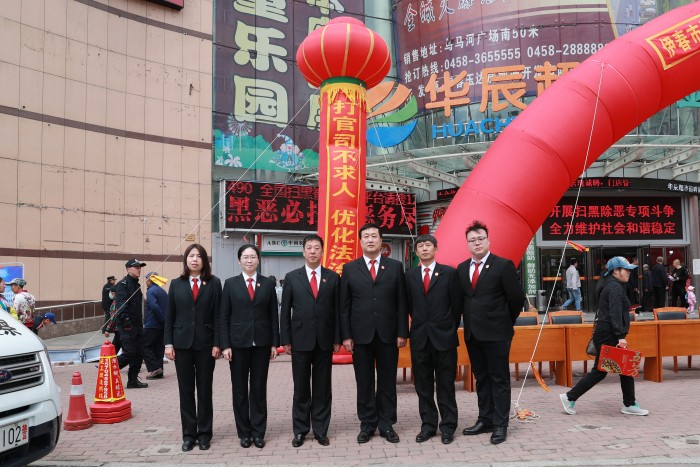 5月31日上午,伊春市中级人民法院党组书记院长韩日强率伊春市两级法院200余名干警在伊春区明星购物广场同步开展“扫黑除恶”和“打官司不求人”宣传活动。市人大常委会主任于大海,市政协主席王瑞,市委常委、政法委书记张国军等相关领导以及部分人大代表、政协委员共同参与现场宣传。