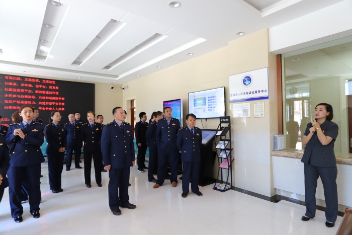 在讲解员的带领下,管理局的同志们饶有兴趣地参观了诉讼服务中心、审判庭、文化长廊、执行指挥中心、书画摄影展示、体能训练室等办公场所。