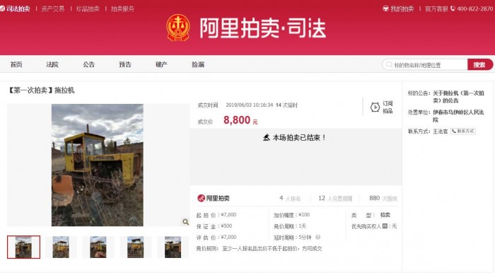 近日,伊春市乌伊岭区人民法院对已生效的7起非法占用农用地案7台没收的涉案农用机械,依法通过淘宝网司法拍卖平台进行拍卖,溢价率达16.67%。