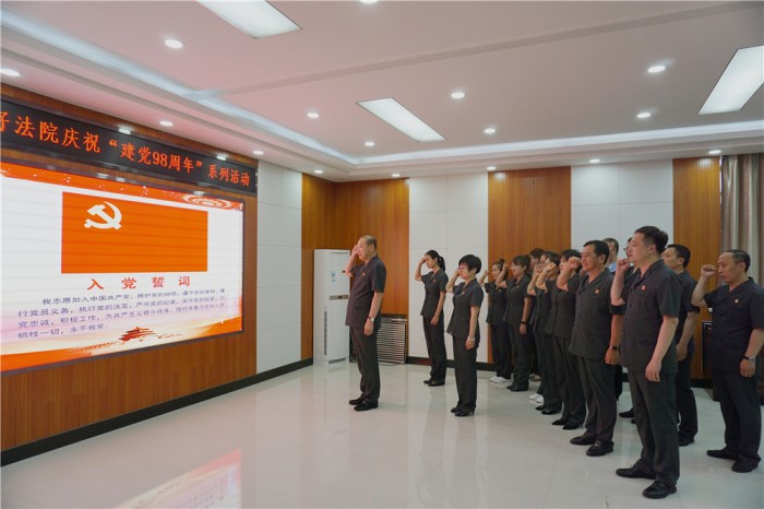 在党组书记、院长丛喜武的带领下举行了预备党员入党宣誓仪式、全体党员重温入党誓词仪式,新老党员干警面对鲜红的党旗,庄严的举起右手,向党旗宣誓,用铮铮誓言,用实际行动矢志不渝的宣誓听党话、跟党走。