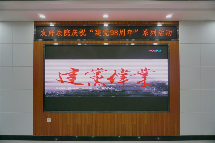 宣誓结束后,友好法院组织干警观看了红色电影《建党伟业》。该电影讲述的是在风雨飘摇的年代里,一群有理想、勇敢的中国人在腐败横行、灾害频发、内忧外患的大环境中,冲破无能、独裁、卖国的政府势力和旧势力的重重阻挠,秘密组党的故事。