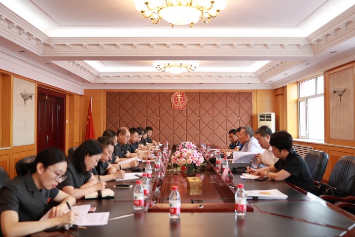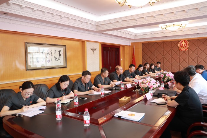 调研组在伊春中院组织召开座谈会,伊春中院党组成员、副院长刘铭福、刑一庭庭长刘玉成、刑二庭庭长李春波及伊春中院全体刑事审判人员参加座谈。