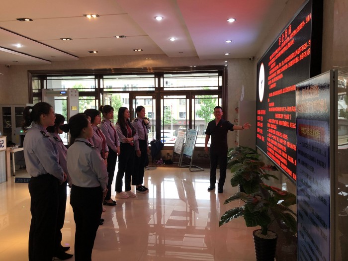 在解说员的带领下,税务局工作人员先后参观了诉讼服务中心、科技审判法庭、审委会会议室、荣誉室等场所。并向参观人员详细讲解了法院针对优化营商环境、“打官司不求人”所采取的“一站式”诉讼服务、完善快速办案机制、提升案件审判质效等一系列措施。