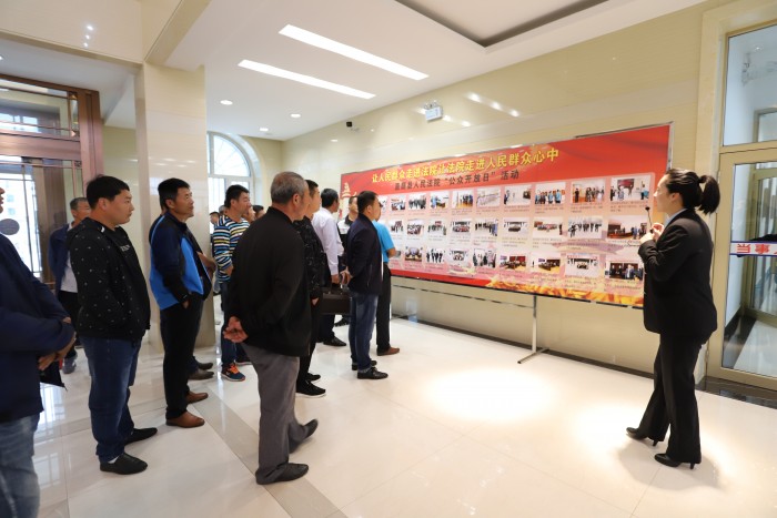 在一楼大厅,从充满象征公平正义的浮雕墙上干部代表们感受到了法律的庄严肃穆。“厚德尚法,公正卓越”的院训体现了嘉荫法院拼搏奋进、司法为民、创先争优的精神风貌。公众开放日的照片集锦也吸引了大家的目光,公众开放日让越来越多的社会群众通过实地观看和体验,全面了解了司法工作的环境,感受了智慧法院、科技法院的进步和飞跃。