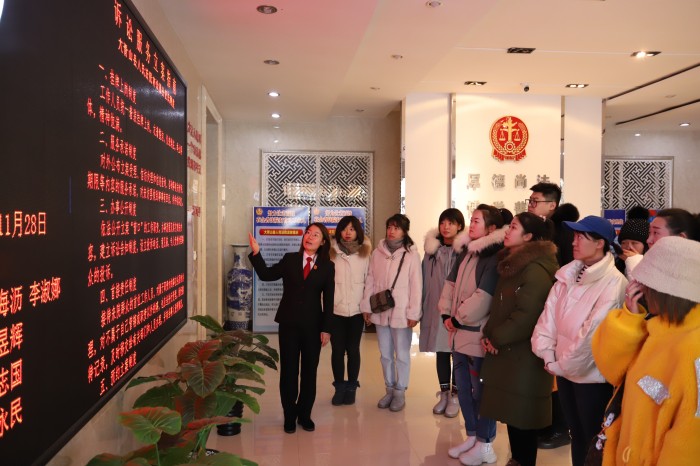 在科技审判法庭,团干部走上法台、坐上法椅、拿起法槌,亲身感受司法的神圣;在执行指挥中心,工作人员介绍了执行指挥中心单兵操作、执行总对总查控系统、限制高消费系统、纳入失信被执行人名单系统。
