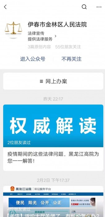 二、积极推行网上办案,减少聚集阻断疫情。通过官方微信公众号等网络平台宣传网上诉讼服务,发送网上立案、调解、诉讼的相关指导链接,公布需要登录的相关网址和详细说明具体操作步骤,并在院内张贴公告,方便群众网上调解、网上立案 、网上诉讼,同时办案人员加强与案件当事人及时沟通,按照相关要求将案件办理期限适当顺延,在减少接触风险的同时确保审判执行工作安全有效开展。