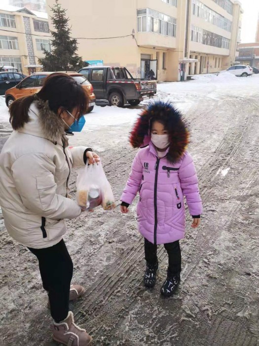 “小区爱心姐姐用塑料瓶装热水送来供取暖”