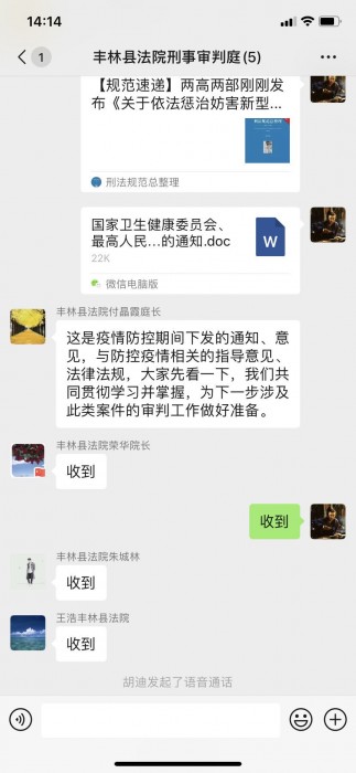 众所周知 “不出门,不聚会,不见面,戴口罩,勤洗手,勤洗脸”正是防控新冠病毒的有效措施。然而,不出门不等于不办公,不见面不等于不学习,丰林县人民法院刑事审判庭全体干警利用微信开展专项学习,主动作为,提升司法能力,从而做到准确适用法律,为依法严惩妨害疫情防控的各类违法犯罪做好准备。