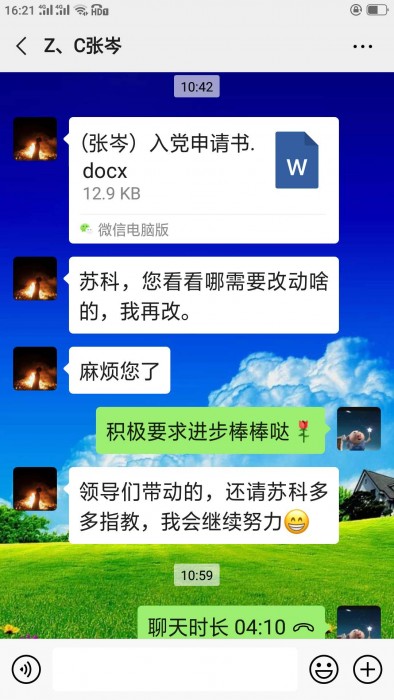 10:42手机微信响,习惯性的快速打开微信,(张岑)入党申请书,丰林县人民法院党总支书记、政工科科长看到入党申请书这5个字,心跳一下加速了,马上回了一句,点开了链接:我志愿加入中国共产党,愿意为共产主义事业奋斗终身。精炼,让人热血沸腾的语言,所有共产党人入党时的誓言。