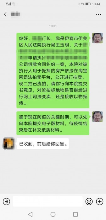 执行办案法官在疫情发生前对被执行人用于抵押的房产公开进行了司法拍卖,近日拍卖标的物二拍流拍,为维护双方当事人的合法权益,办案法官主动添加申请执行人公司的法定代表人微信,向其告知二拍流拍后的相关权益以及作出以物抵债选择后的法律后果。