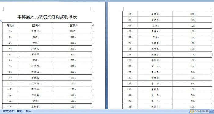 此次活动全程零接触,自愿原则,有意向的通过支付宝发送到指定账户,再由专人负责统一转交到慈善组织。倡议一经发出,丰林县法院全体干警积极响应院党组号召,踊跃捐款。全院共有86名干警参与,共筹集善款12840元,目前该善款已定向捐给丰林县应对疫情防控指挥部,转账存入伊春市新青区慈善会账户,用于全县疫情防控工作。