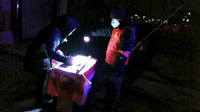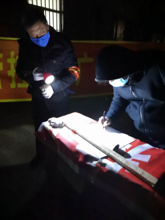 为科学、有效地应对新冠肺炎疫情,避免疫情蔓延,伊春市友好区防疫指挥部决定,对全区居民外出实行24小时管控。接到命令后,负责向阳社区人员外出管控任务的伊春市友好区人民法院迅速行动,抽调四名干警二人一班负责夜间值守,四名同志从此成了抗击疫情、守护人民群众生命安全的夜行者。他们每天晚上19点30分上岗,一直坚守到第二天7点30分。漫长的夜晚,他们战风雪斗严寒,冷了到车里暖暖脚,饿了泡碗方便面,到目前为止已坚守了十三个不眠之夜,连续的奋战,眼睛熬的布满了血丝,体重掉了几斤,但是没有一个叫苦的,每天准时上岗,认真审核登记着出入人员的信息,确保了出入人员手续齐全、登记信息准确无误。