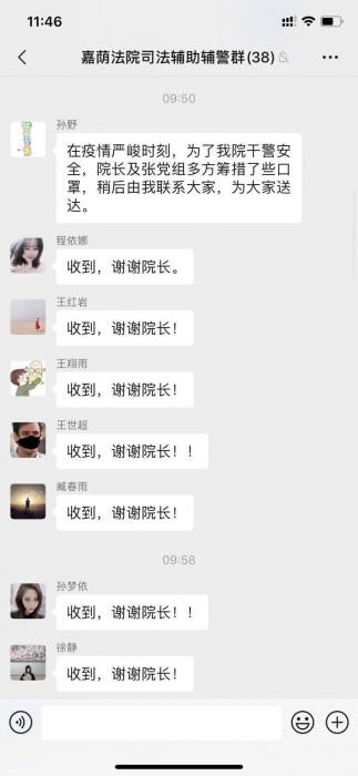 口罩的数量虽然不多却让在疫情一线值守的干警们感受到了院领导的关爱,隔离病毒绝不隔离爱,做好防控更要保护自身。全体法院干警怀着战胜疫情的决心和信心,与病毒抗争到底!