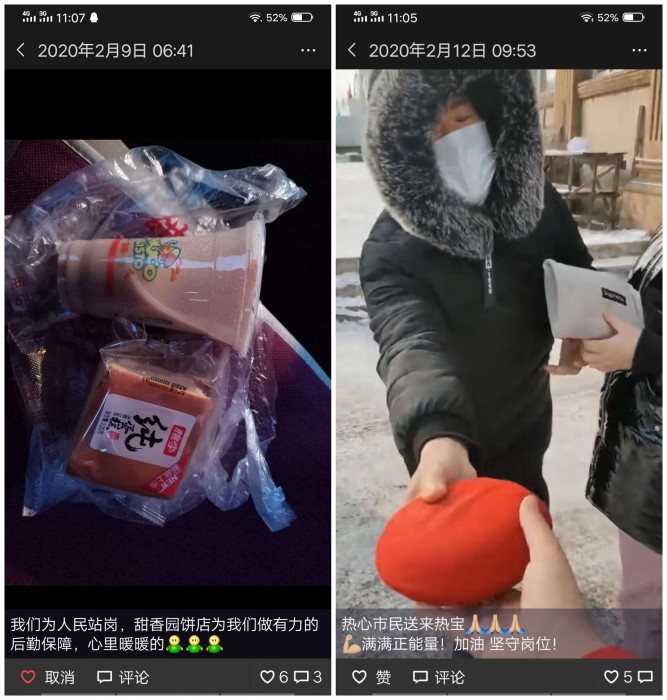 西林镇甜香园饼店、新万家乐超市等商店的老板一连多日给西林法庭卡点的干警送去牛奶、热豆浆、面包等食物,每次都是放下一大包食物转身就走,工作人员追上去表示感谢,他们有的开车迅速离去,有的回头说“你们辛苦了,吃点东西暖暖身子”。防控小区内的居民在积极配合干警工作的同时,每天给卡点志愿送热水、送暖宝宝;同样是在防疫一线工作的环卫工人也给卡点志愿者送水果。
