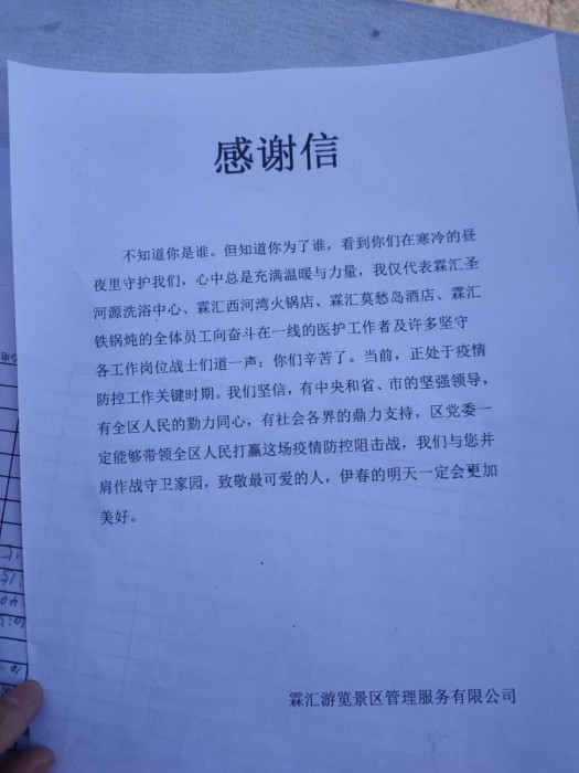 2月27日,法庭卡点志愿者收到一封来自霖汇游览景区管理服务有限公司的感谢信,同时,收到该公司总经理刘革给卡点志愿者送来的50个暖贴,卡点志愿者向他表示感谢,他说“绵薄之力,这些暖贴先用着,明后天我再给你们送!”