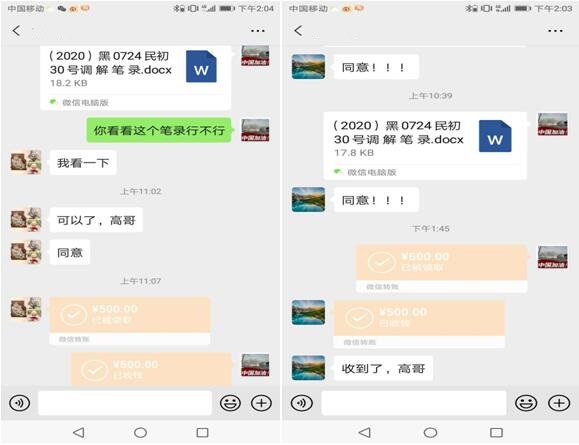 法官在微信群里告知双方当事人,在当前抗“疫”关键时期,为了保护当事人的生命安全、身体健康和保障当事人的合法权益,建议双方当事人进行线上开庭调解。双方当事人不同意在同一群里视频开庭调解,同意分别在微信上调解。尊重双方当事人的意见,上午10时,法官高晓明、秦瑞驰、书记员张晓微,分别同双方当事人沟通,做调解工作,并及时转达双方当事人的意见,形成调解笔录让双方当事人阅读确认,调解工作在双方当事人的配合下顺利开展。