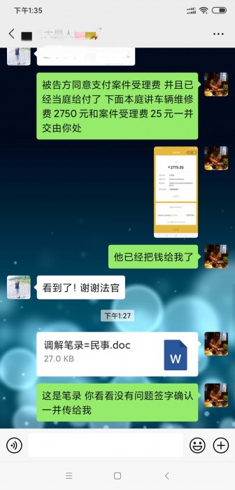 通过微信平台及电话沟通的方式,办案法官以电子化方式向被告出示了原告提交的发票、出院证、伊春区鑫顺达修理厂证明、协议书等证据,并询问了被告的意见,被告对车辆维修费用无异议,并说我老板高某海已经答应了这钱由他支付。在办案法官的调解下,原告主动放弃了交通费300.00元的请求,高某海同意一次性给付修车款2.750.00元,双方当事人自愿达成了和解协议。被告人当庭以微信的方式给付原告赔偿款2,750.00元,案件受理费25.00元由被告雇主高某海负担,至此,这起机动车交通事故责任纠纷案件以调解方式得到了圆满解决。