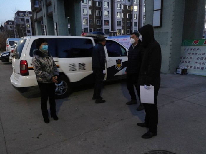 清晨7点钟,伊春市中级人民法院带班院领导赵冶萍和第一班执勤干警已到达龙栖湾小区防护点,检查、扫码、登记......一天的执勤工作有条不紊地开始了。