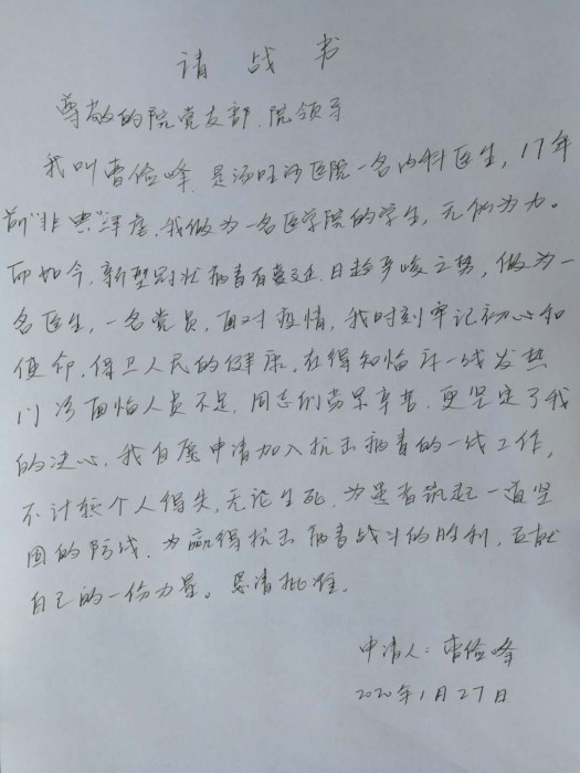 新冠肺炎疫情突如其来,让大家毫无防备,作为一名医生更要第一时间担负起疫情防控的责任。曹俭锋本是一名内科医生,但他于1月28日毅然写下请战书,主动到发热门诊工作,不计生死,不计报酬,无私奉献。疫情防控期间,他诠释了“救死扶伤、甘于奉献”的职业精神,以实际行动践行共产党员崇高的奉献精神和敢打硬仗的担当作风。他连续在发热门诊隔离留观室工作50余天,为武汉及疫区返乡人员、外省返乡人员和本地发热患者诊疗,有发热患者来就诊他第一个冲在前,询问患者身体状况,为患者检查身体,做好相关诊疗工作。为了不把风险带给家人,他工作期间没有回过一次家,但妻子和儿子都非常支持他的工作,没有一句怨言,这让他在工作中没有后顾之忧,全身心的投入到防控疫情工作中。