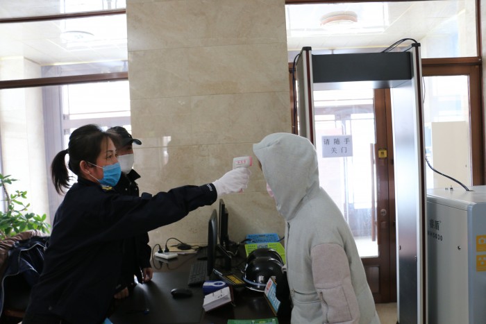 加强外来人员登记。来院人员一律实行登记式管理,严格落实“扫码、测温、戴口罩、登记”四项措施,记录来院人员姓名、单位、来院时间、体温检测结果,由值班干警引领进入。