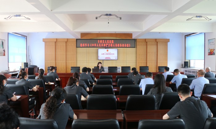 7月2日上午,丰林县人民法院组织全体干警集中学习《中华人民共和国公职人员政务处分法》。副院长于虹领学并解读了《中华人民共和国公职人员政务处分法》颁布的意义、概况,并对该法的适用对象和基本原则、政务处分种类和适用规则、公职人员违法行为及适用的处分、政务处分程序等主要内容进行了详细阐述。