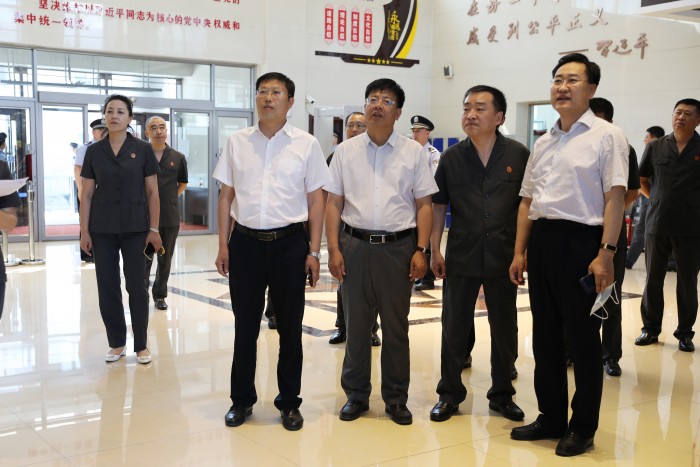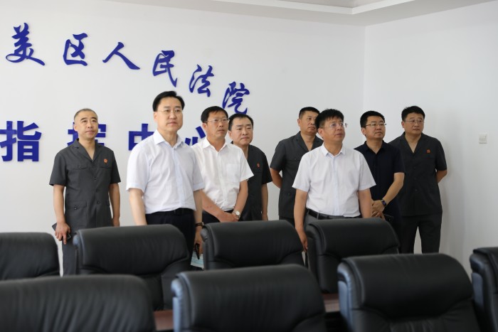 韩日强一行先后参观了伊美区法院的法官墙、科技法庭、诉讼服务中心、执行指挥中心、党建活动室、党建文化长廊等场所。